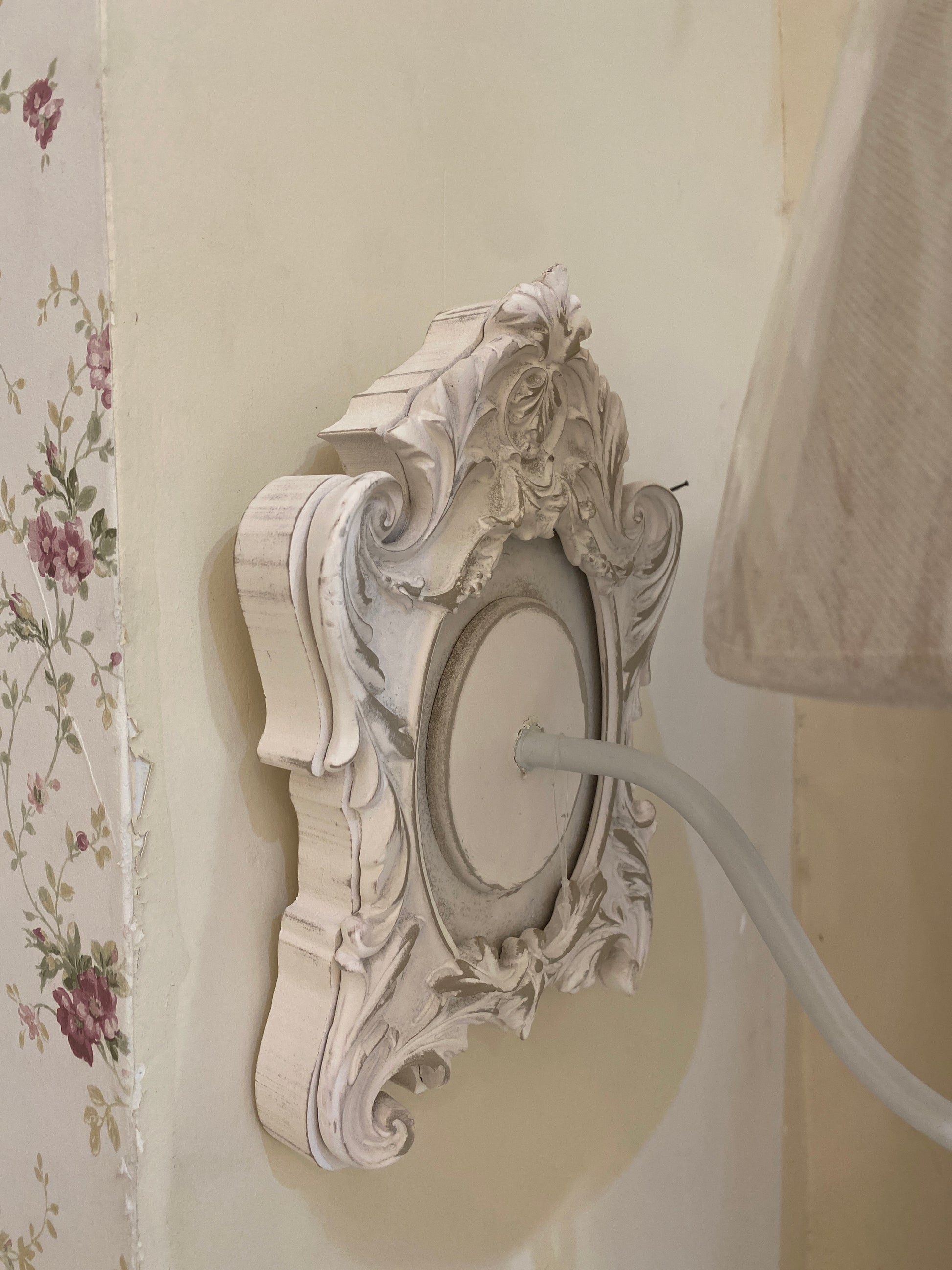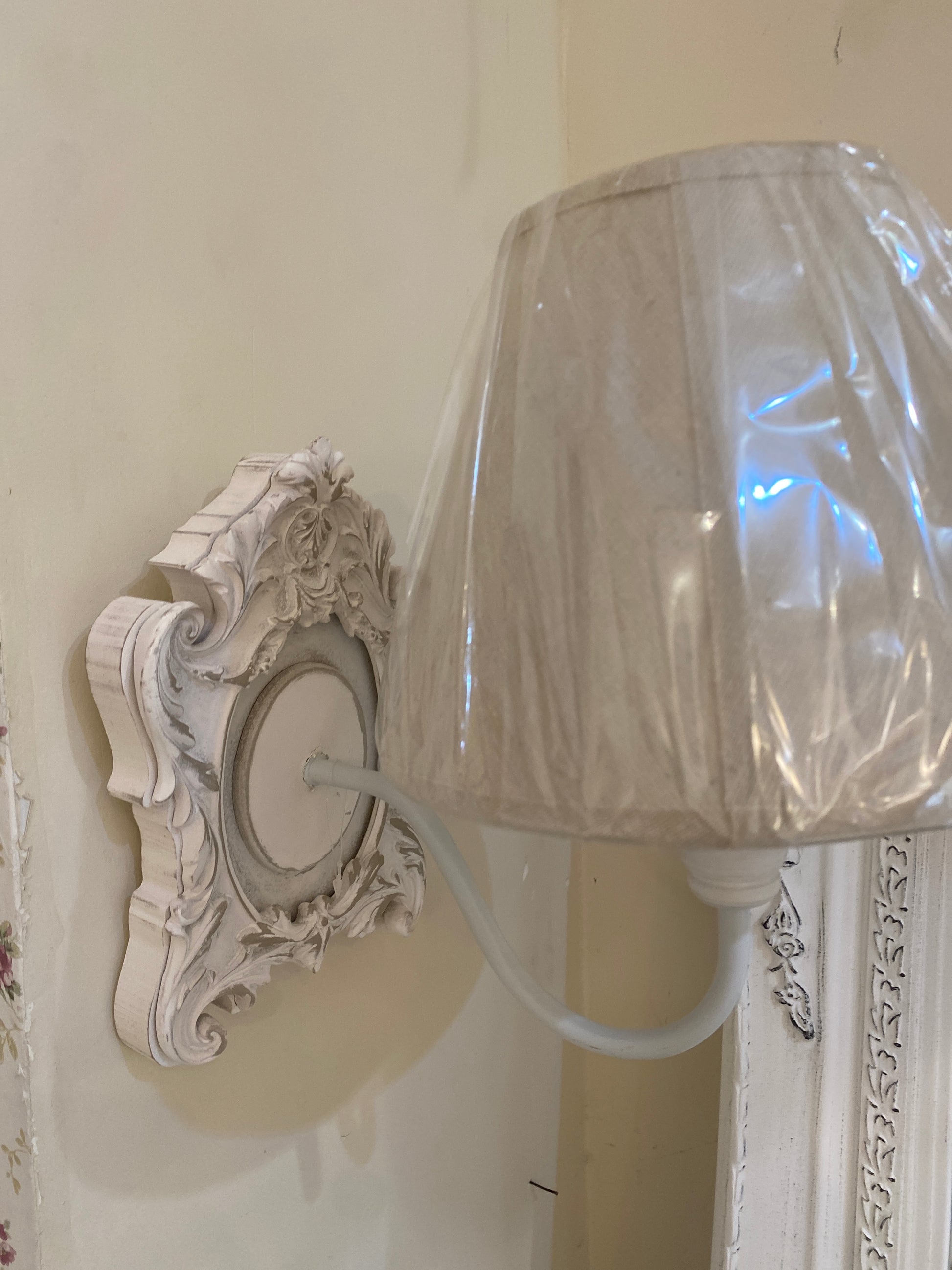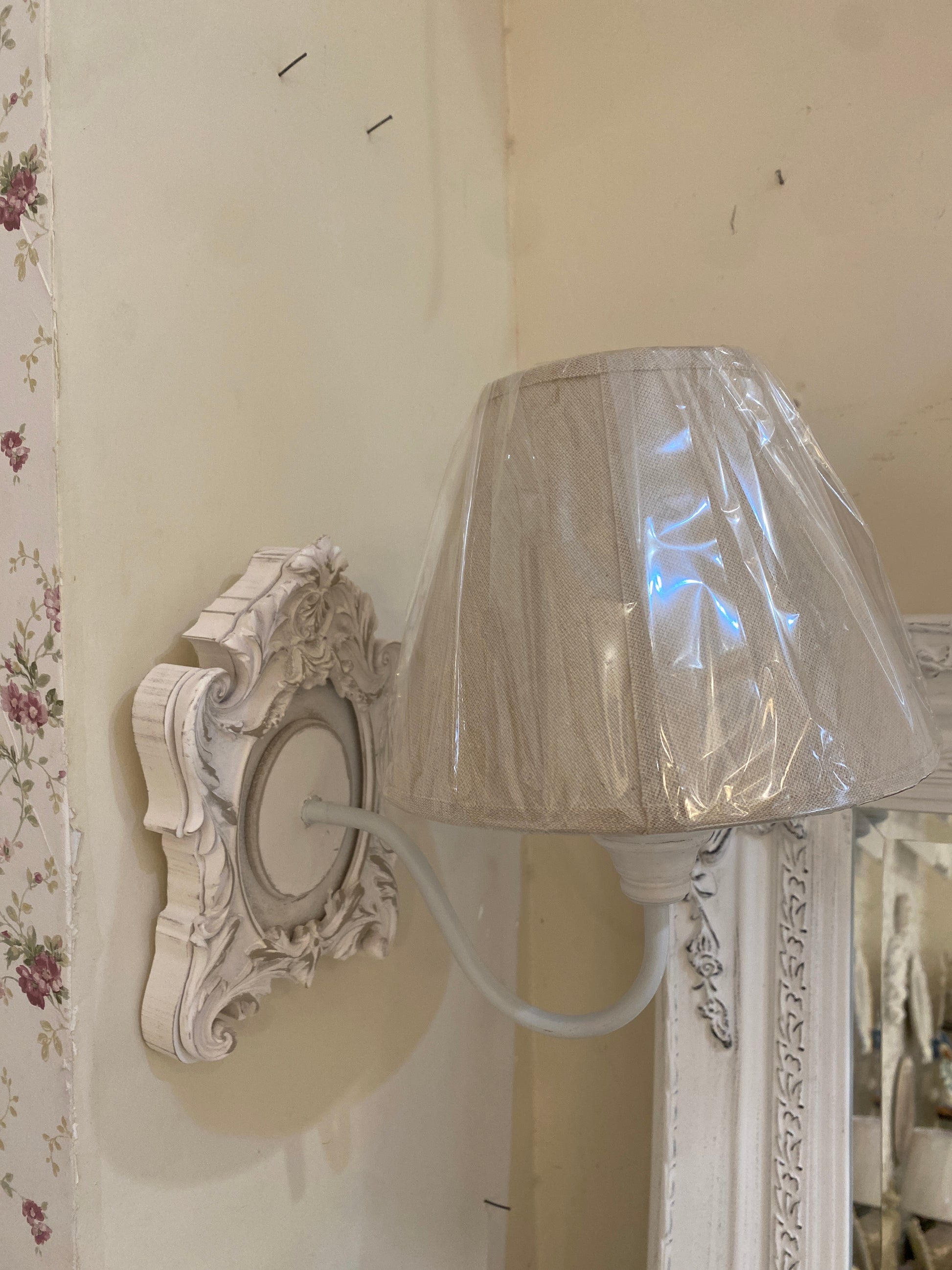 Coppia Applique da parete in legno bianco stile shabby chic con paralume in tessuto