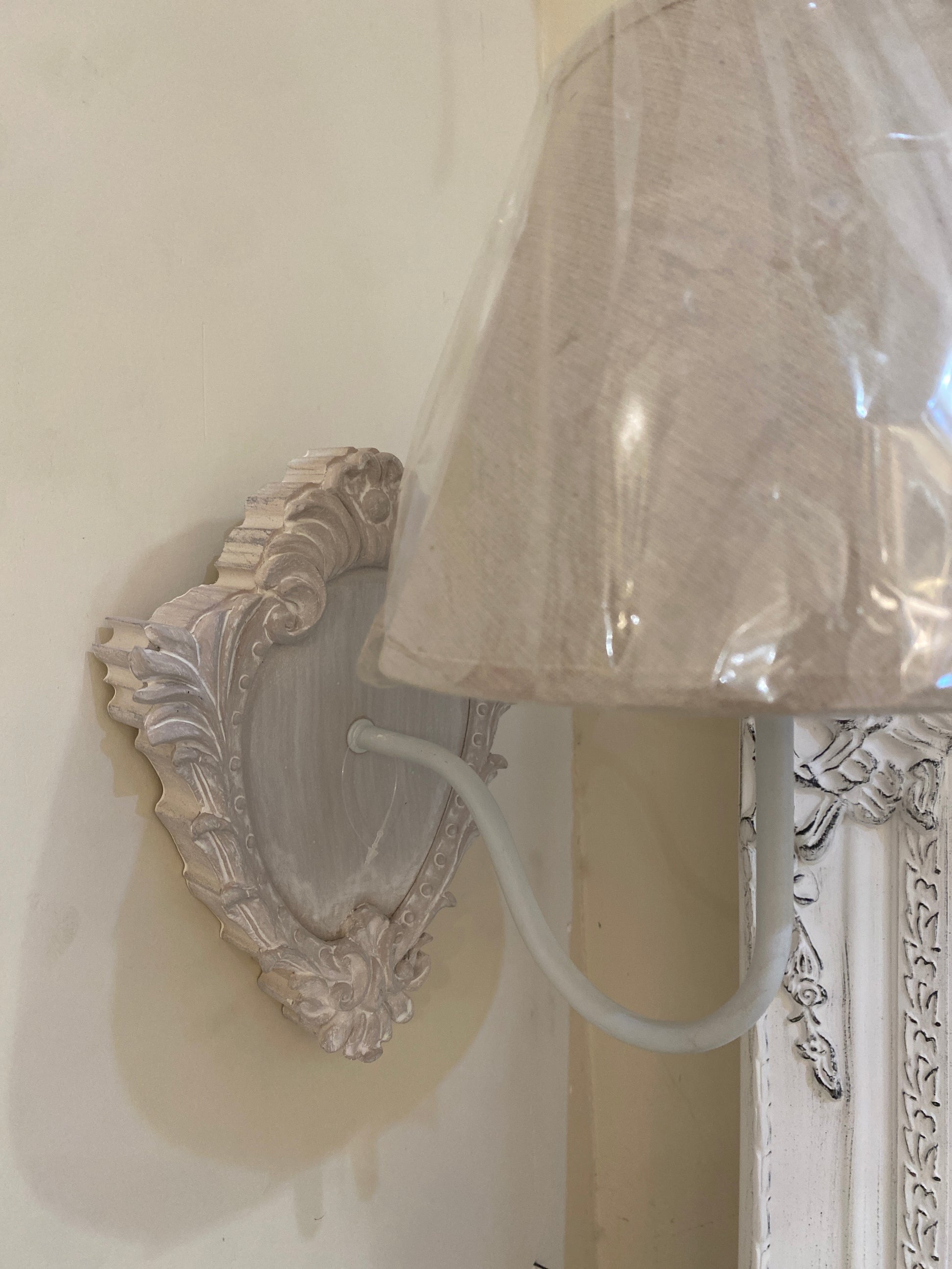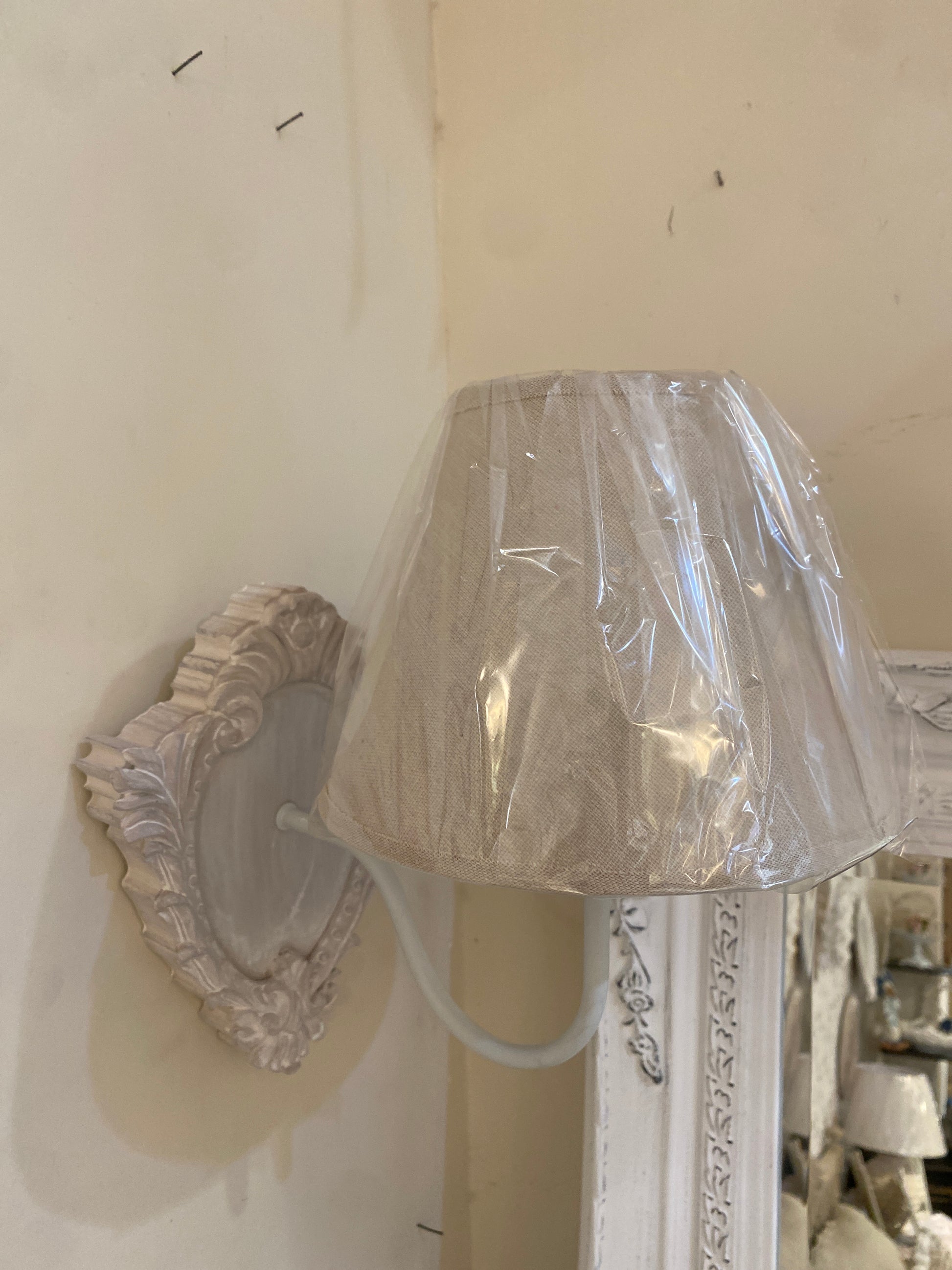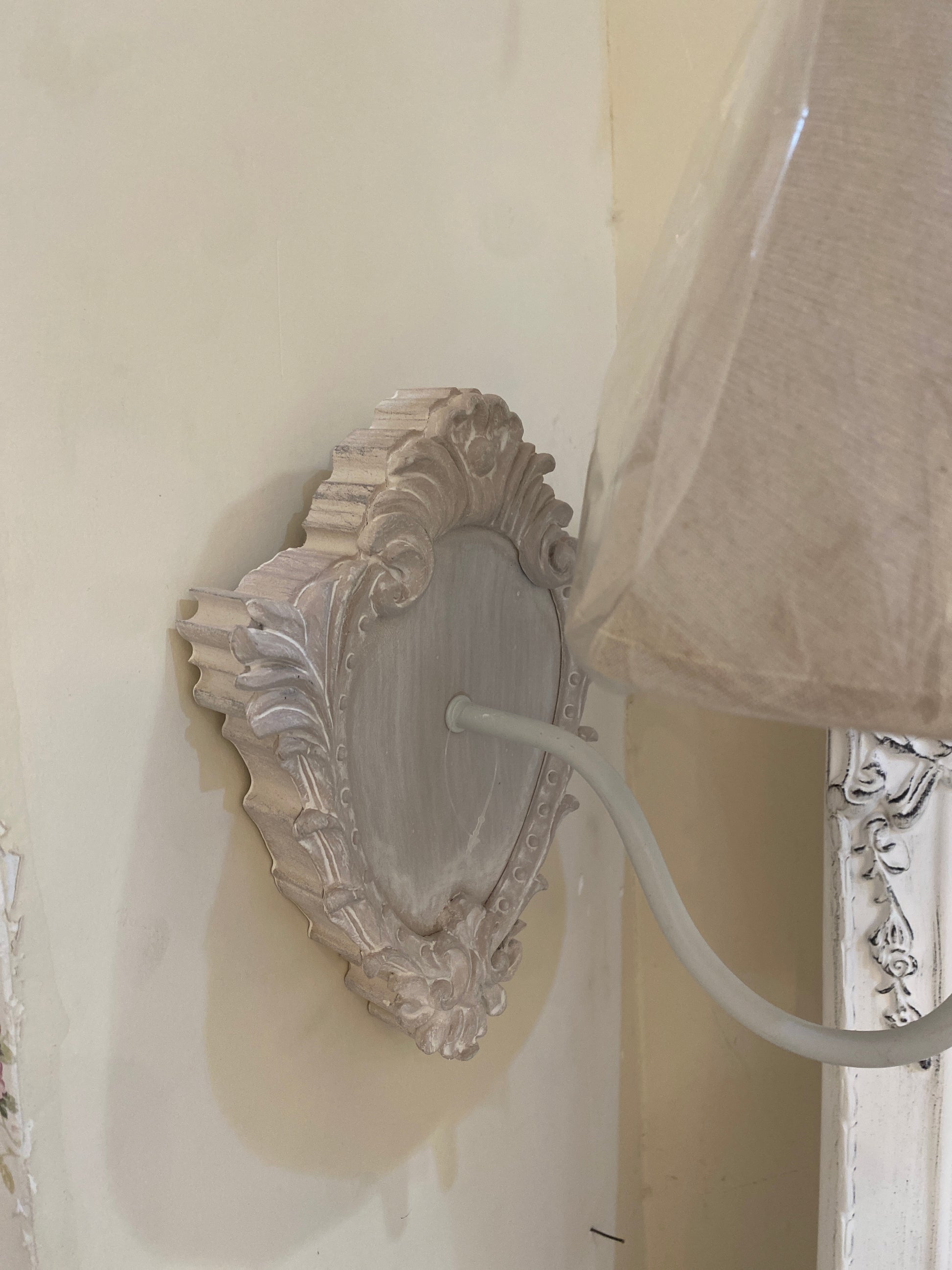 Coppia Applique da parete in legno stile shabby chic con paralume in tessuto