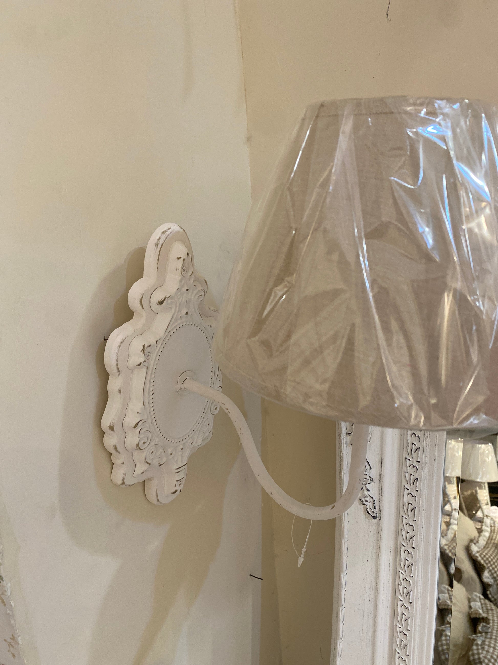 Coppia Applique da parete in legno bianco stile shabby chic con paralume in tessuto
