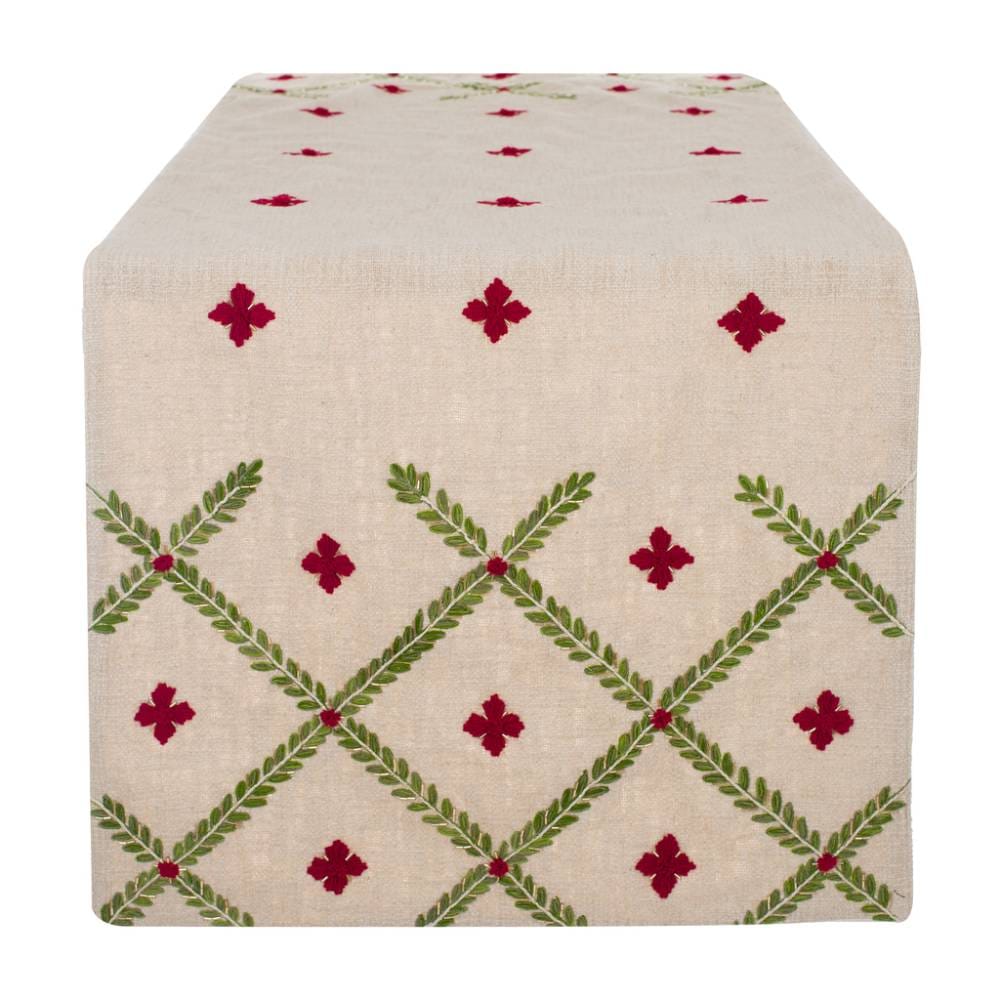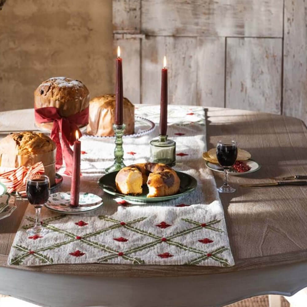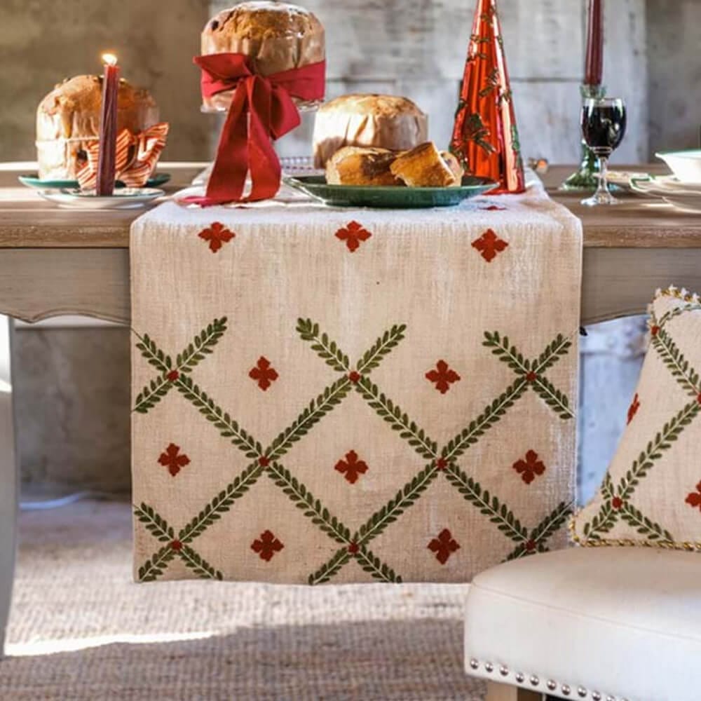 Runner natalizio in cotone con ricamo geometrico a croci rosse e intrecci verdi, finitura con bordo dorato intrecciato. Collezione Trame.