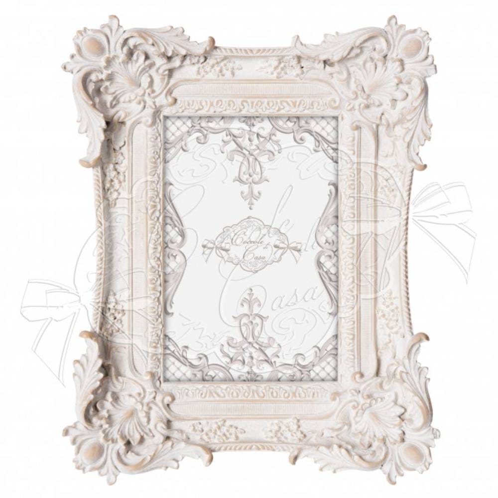 Un portafoto in resina bianca decapata con raffinati dettagli barocchi in rilievo. Perfetto per custodire le tue fotografie con uno stile romantico e sofisticato.