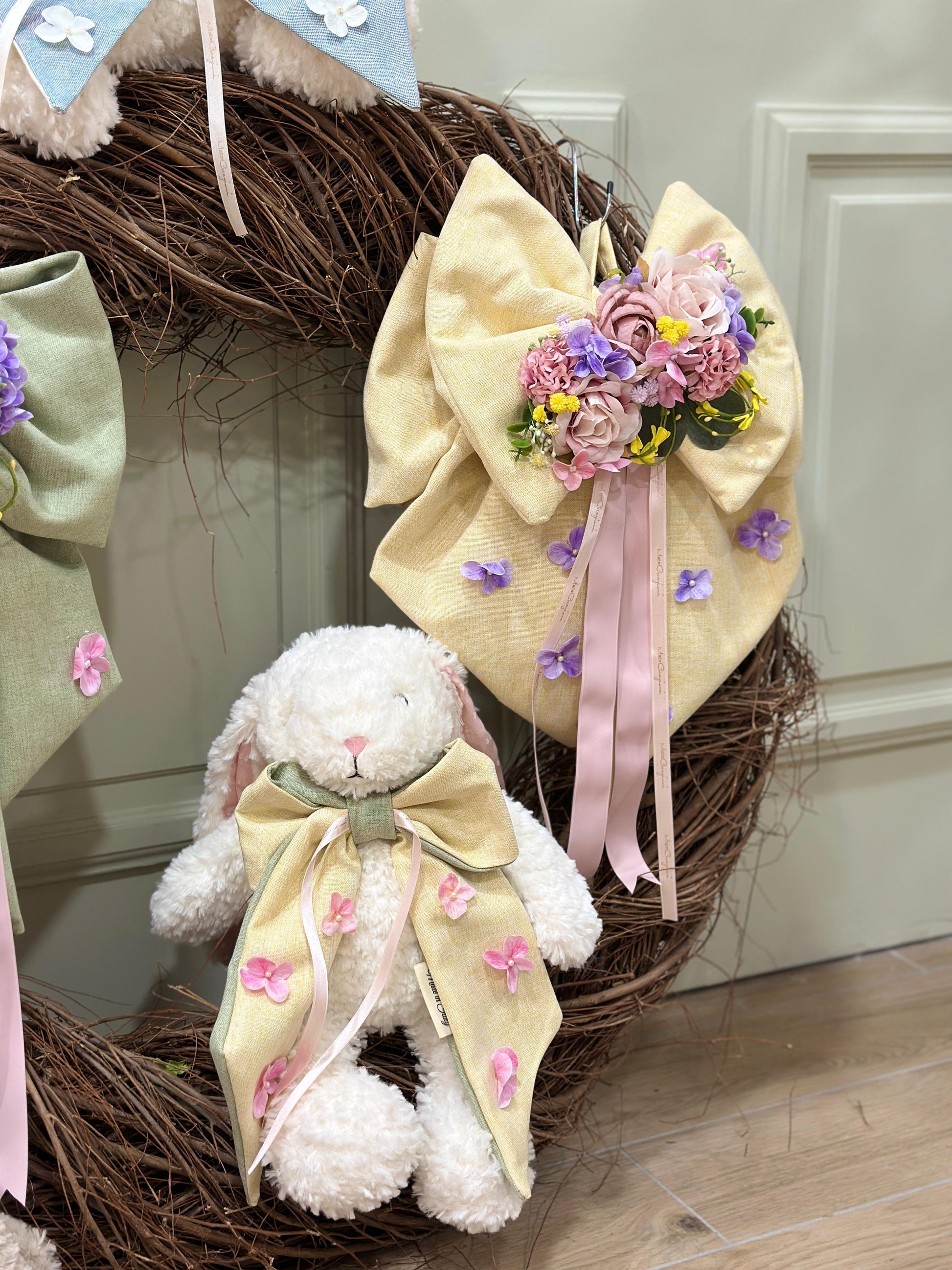 Coniglietto pupazzo con fiocco giallo, molto soffice, lavorato a mano.