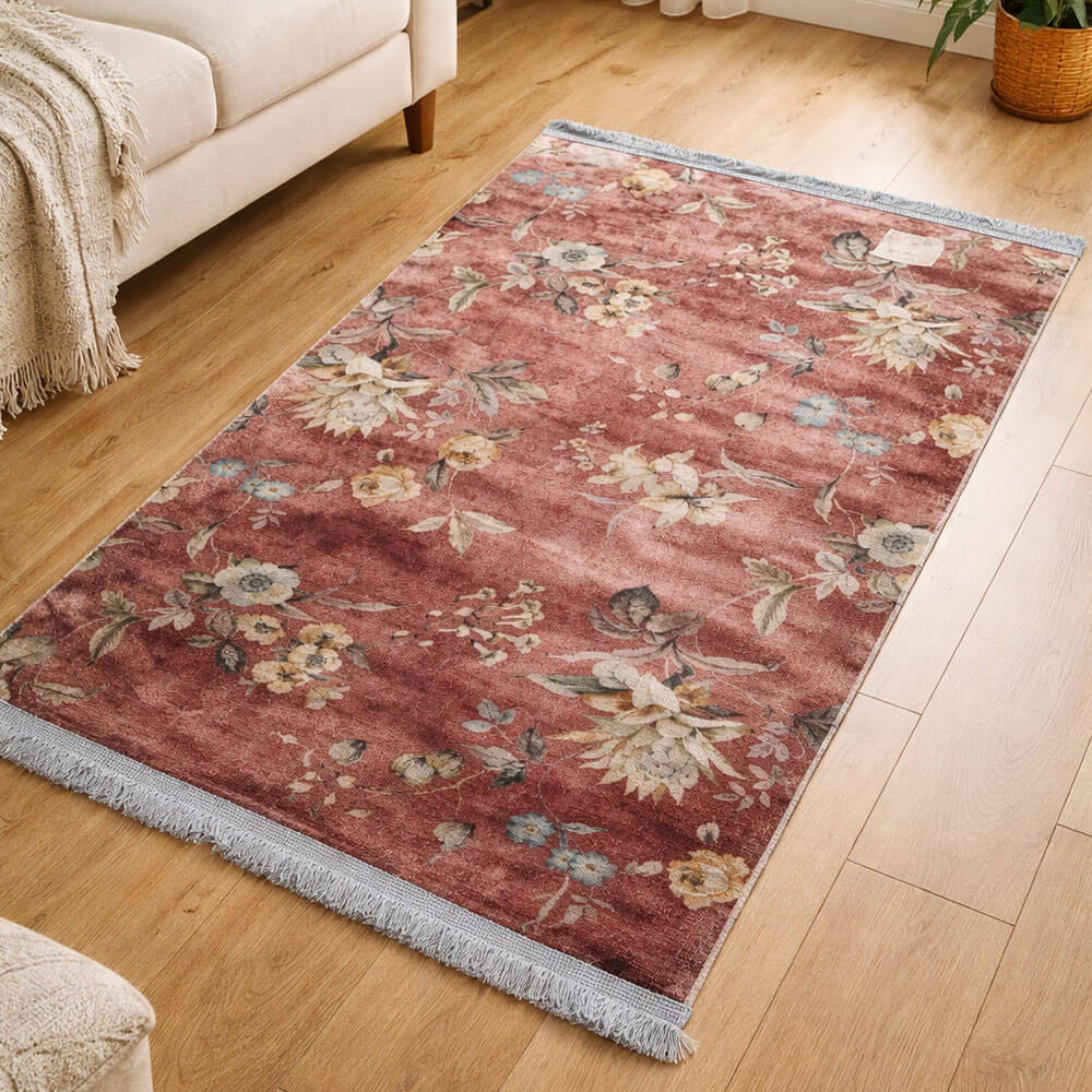 Un tappeto romantico in velluto malva con stampa floreale nei toni crema, cipria e senape, arricchito da frange grigio perla che ne esaltano l’eleganza. Perfetto per donare un tocco scenografico e accogliente a ogni stanza. Disponibile in due misure.