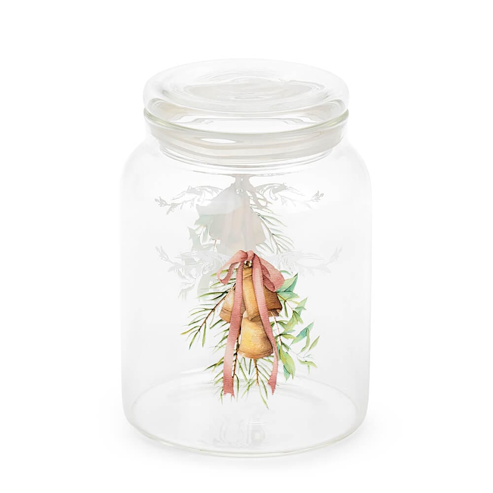 Barattolo in vetro borosilicato con tappo ermetico e decoro natalizio: campanelle dorate, fiocco rosa e rami verdi. Elegante scatola regalo inclusa.