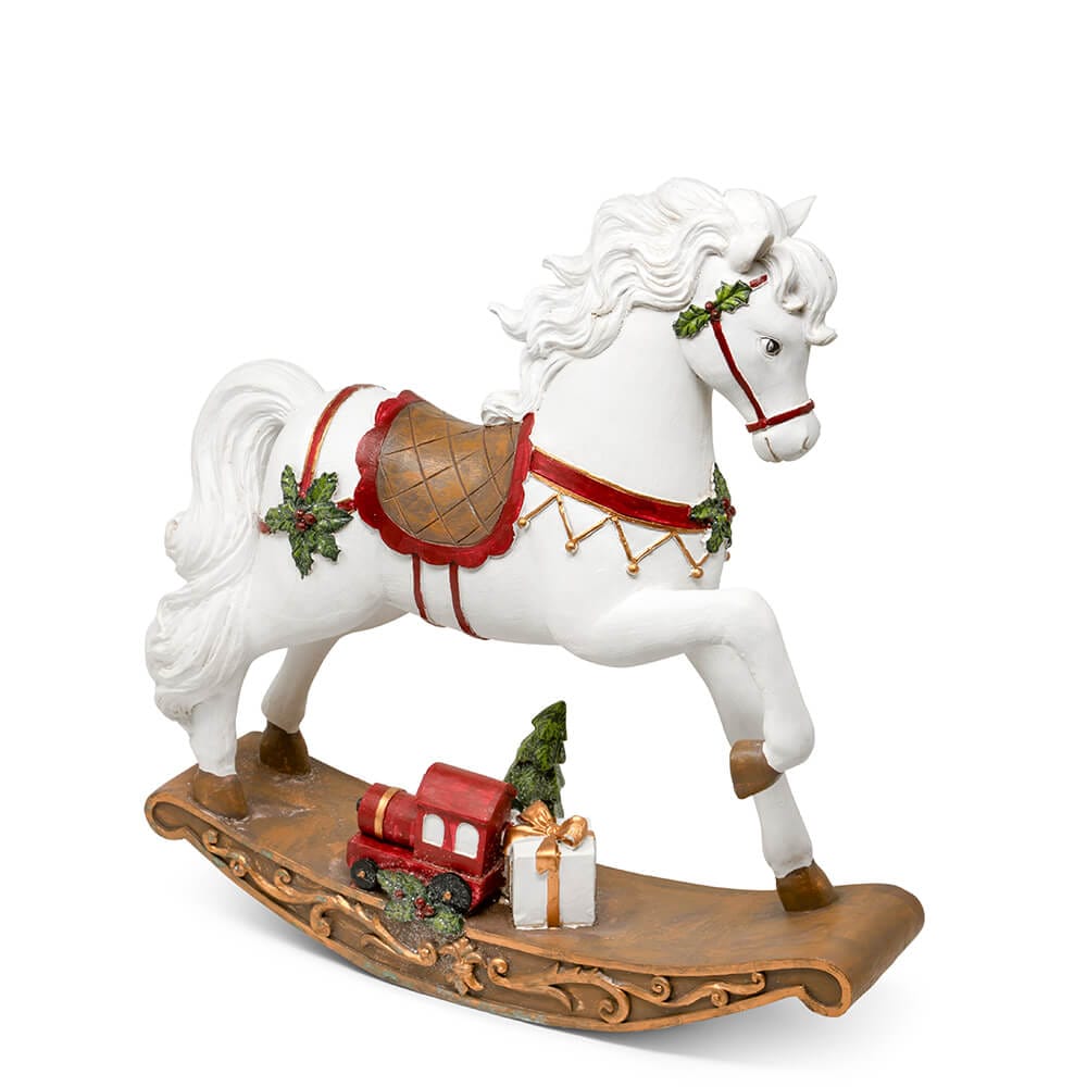Cavallo a dondolo decorativo in resina dipinta, con finitura bianca opaca, dettagli dorati e accenti natalizi. Sotto la base ricurva, un trenino rosso, pacco regalo e abete innevato. Una decorazione elegante e scenografica della collezione