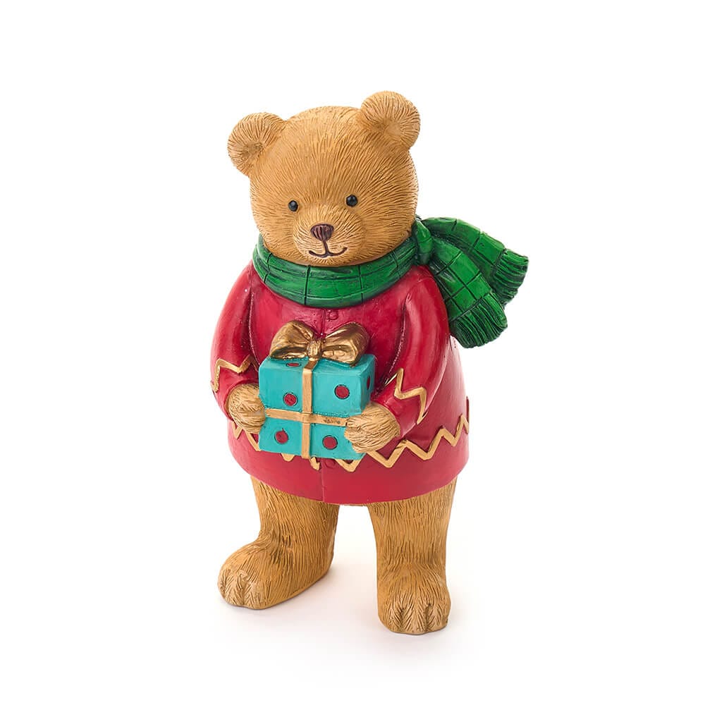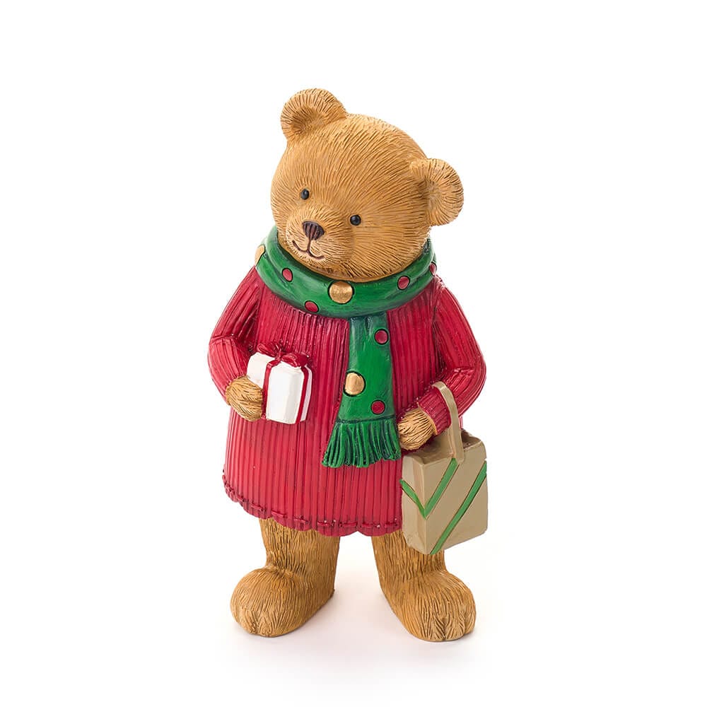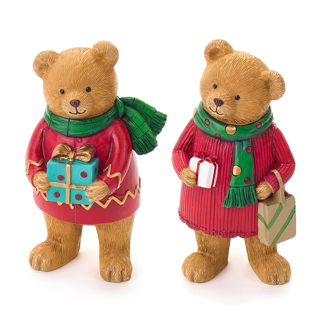 Coppia di orsetti natalizi in resina, alti 15,5 cm, vestiti con cappottini rossi e sciarpe verdi. Uno tiene in mano un regalo azzurro, l’altro una borsa e un pacchetto. Colori vivaci, dettagli curati e spirito festoso per decorazioni natalizie di charme.