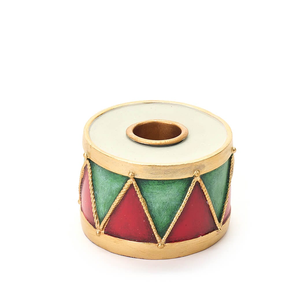 Portacandela in resina a forma di tamburo natalizio, collezione La Giostra di Amelie. Colori eleganti bianco e verde, rosso e oro con dettagli a rilievo e finitura satinata. Ideale per tealight.