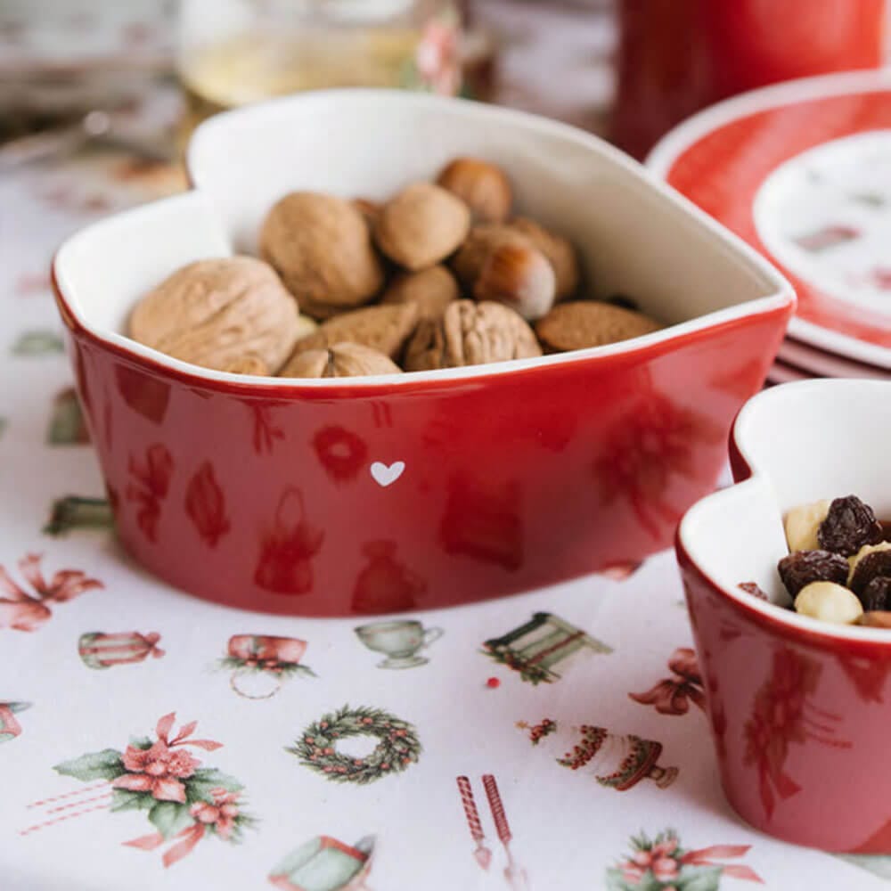 Set composto da due ciotole in porcellana a forma di cuore, una grande e una piccola, nei toni del rosso e bianco. Design romantico ed elegante, parte della collezione Storia di Natale, con scatola regalo inclusa.