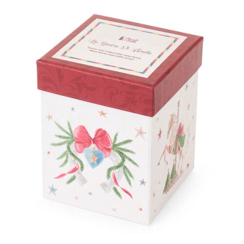 Tazza in porcellana da 380 ml decorata con cavallino a dondolo, alberelli e stelle. Completa di coperchio in porcellana coordinato e scatola regalo rigida illustrata.