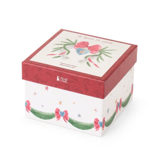 Tazza mug in porcellana da 370 ml decorata con fiocco rosso, cuore azzurro e rametti di pino su fondo bianco punteggiato di stelline. Bordo superiore rosso lucido e manico con dettaglio coordinato. Confezione regalo decorata inclusa. Collezione