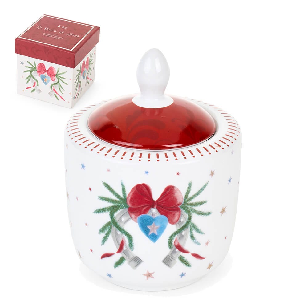 Zuccheriera in porcellana smaltata bianca con decorazioni natalizie ispirate alla collezione. Coperchio rosso lucido con pomello bianco e grazioso motivo con fiocco rosso e cuore azzurro. Completa di elegante scatola regalo coordinata.