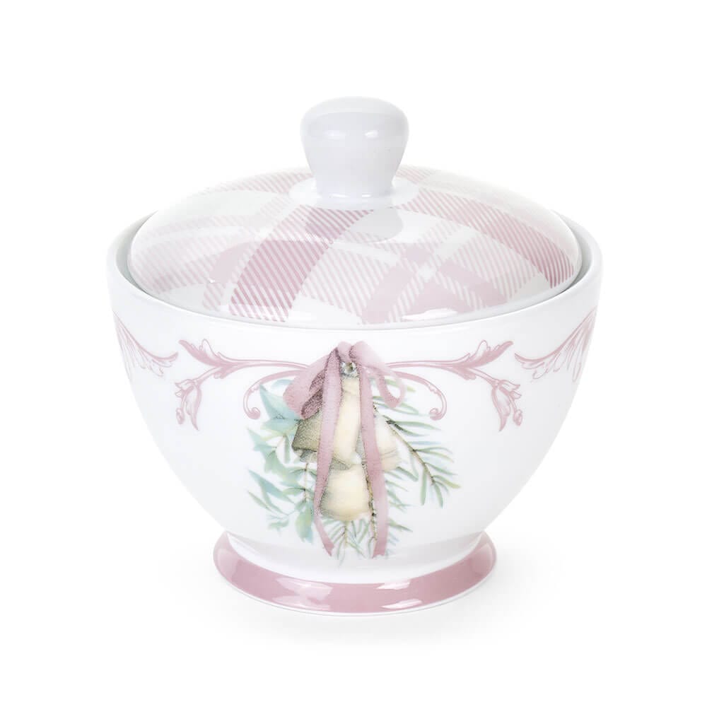 Zuccheriera in porcellana decorata con campanelle natalizie, fiocco rosa e dettagli scozzesi tono su tono. Parte della romantica , è dotata di coperchio coordinato e confezione regalo.