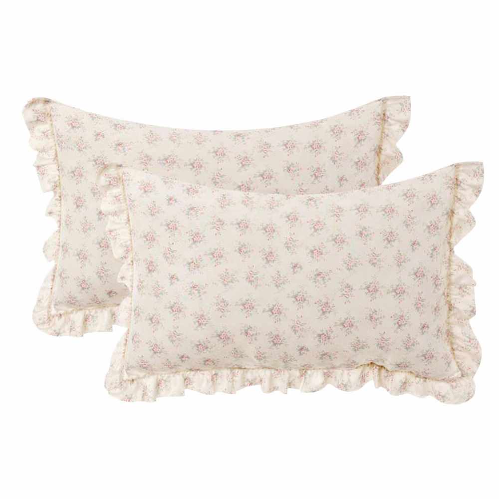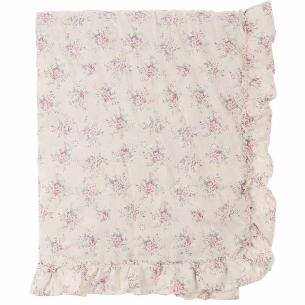 Trapunta letto singolo in microfibra con stampa floreale rosa, gala arricciata e stile romantico.