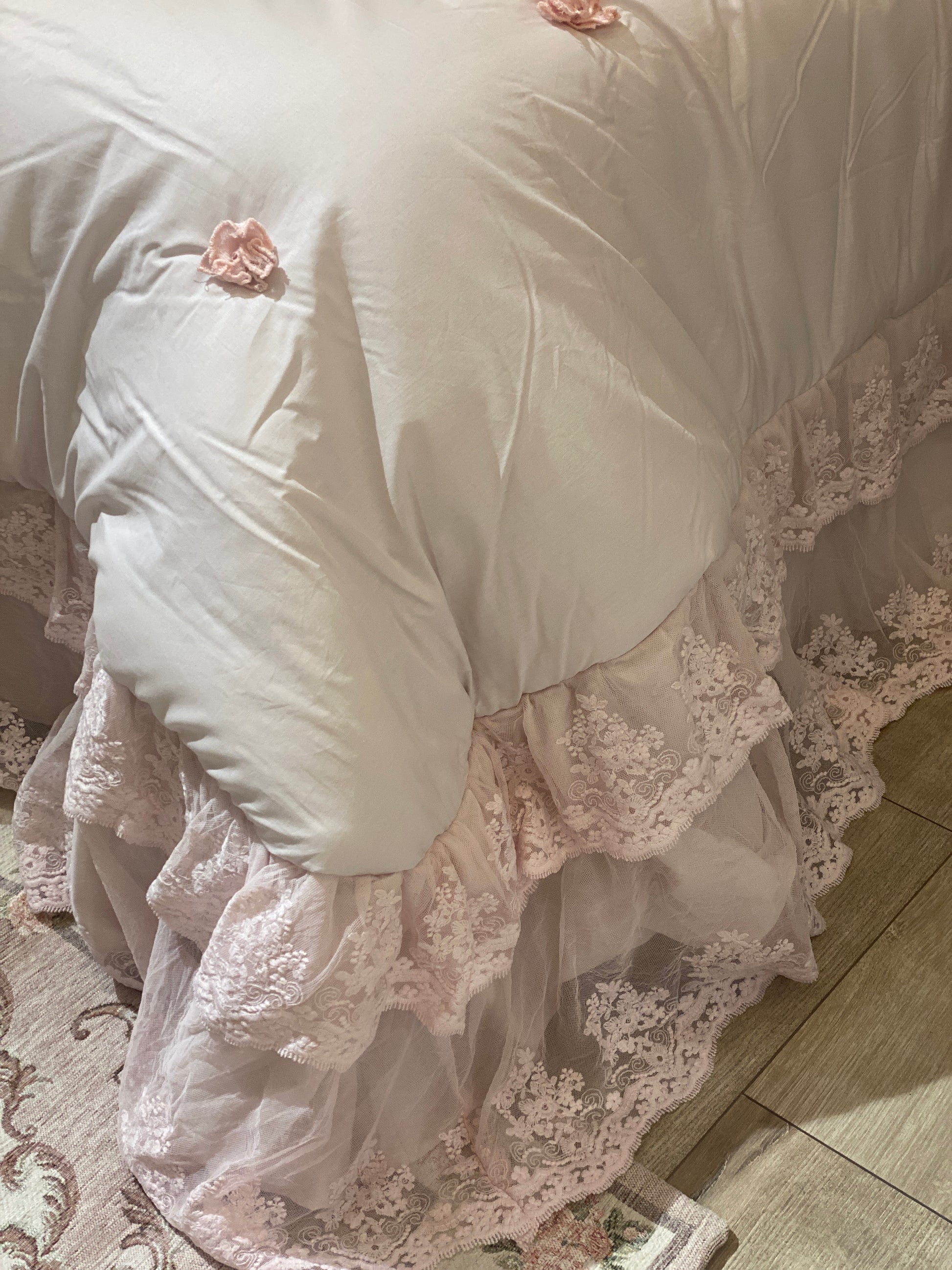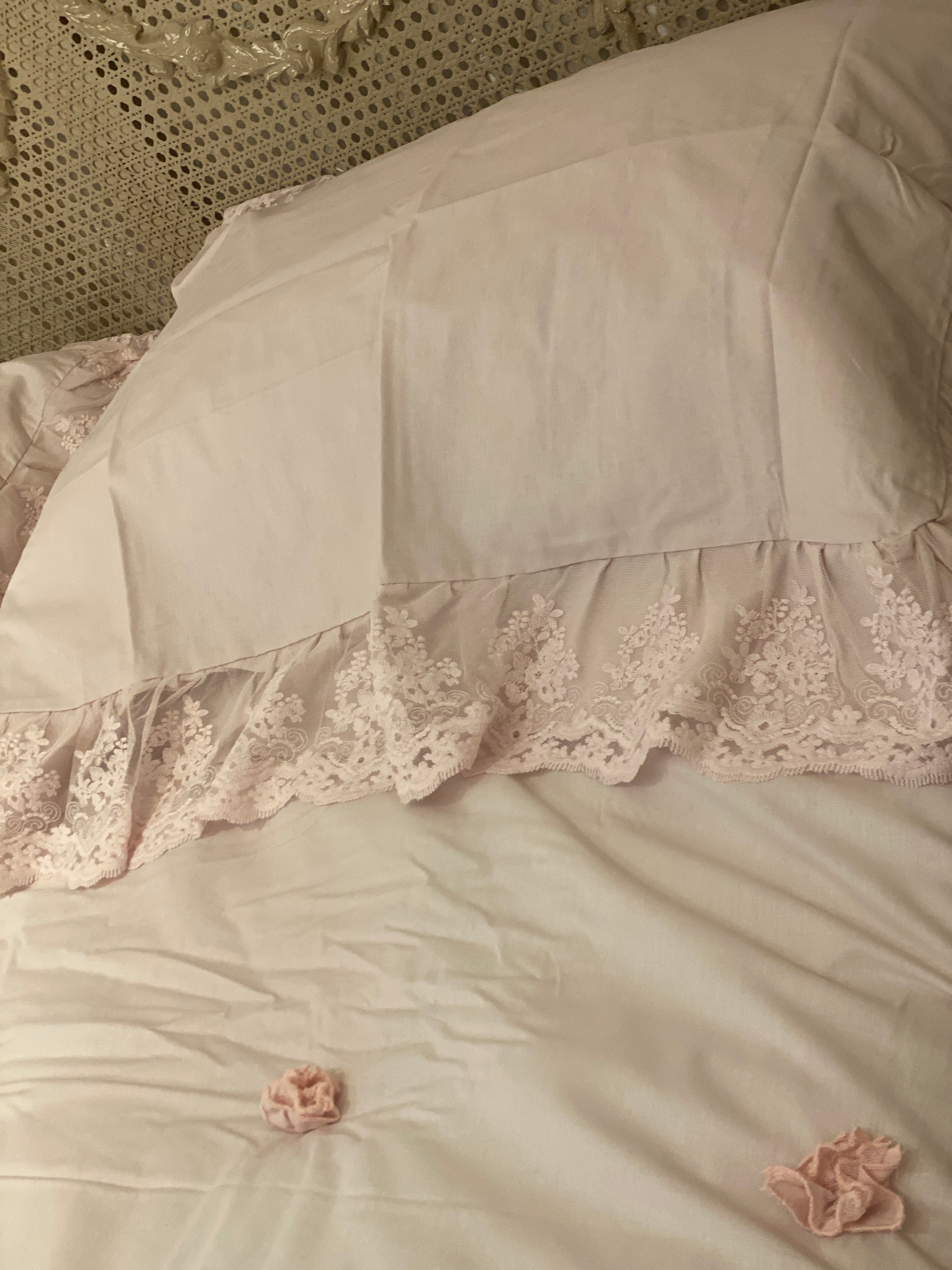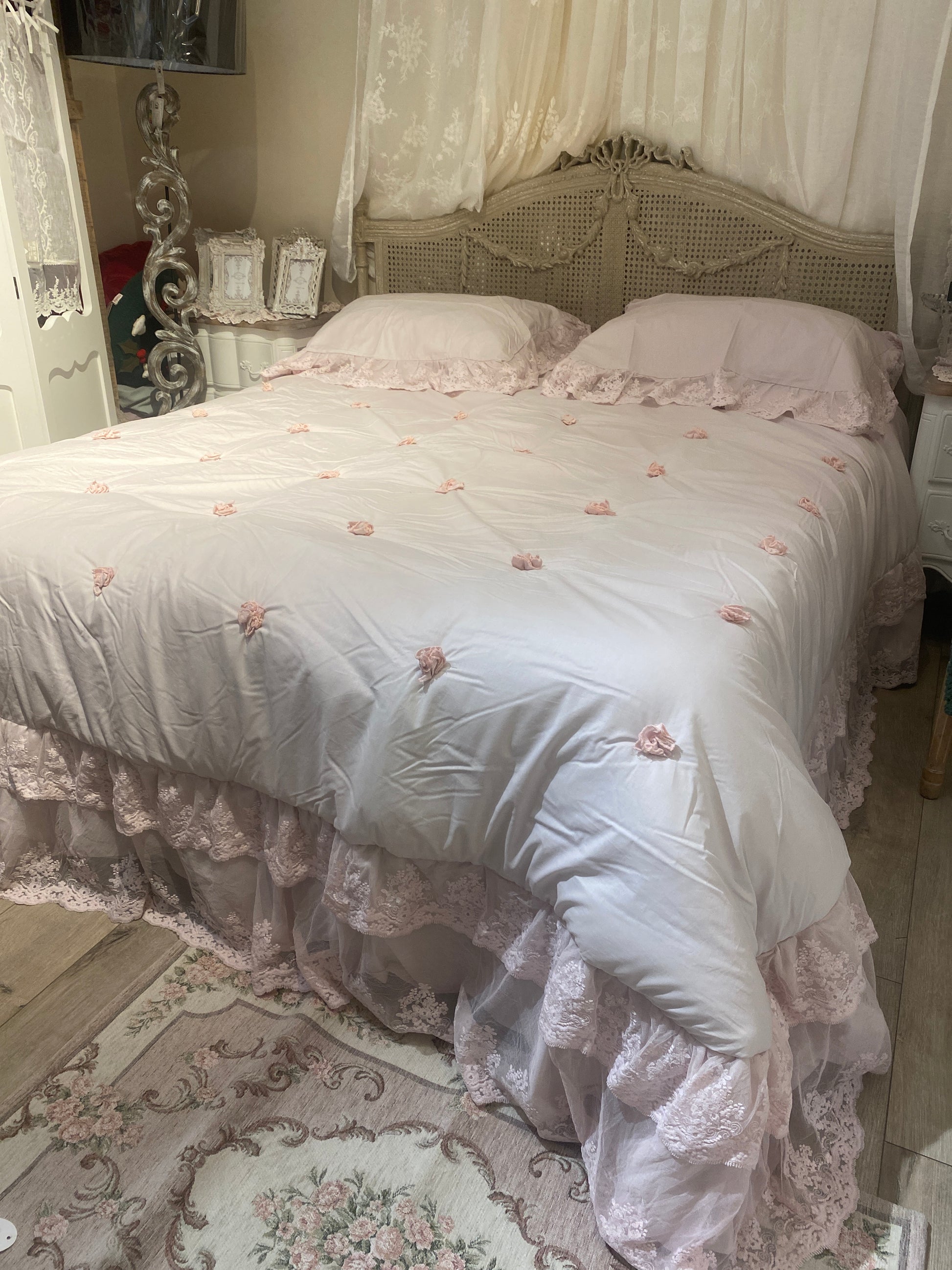 Trapunta romantica calda e avvolgente con le sue balze in pizzo ci porta le applicazioni di roselline e correlato dei copriguanciali